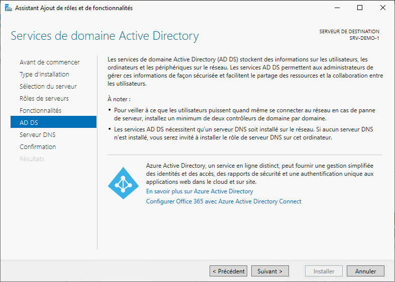 - A partir de là, les fenêtre sont spécialisée selon les rôles que l'on installe. On se retrouve donc sur un fenêtre d'information sur AD ainsi que Azure. On lit et on passe à la suite grâce au bouton