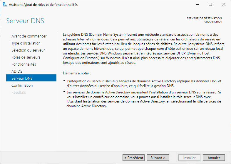 - Comme vu précédemment, AD est intimement lié au service DNS, je conseille vivement d'installer ce dernier en même temps. Pour cela, on cochera la case