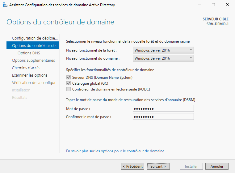 RODC. L'optionGCn'est pas obligatoire. Elle dépend au final d'un ratio entre le nombre de requête AD (autrement dit la taille de votre infra) et le nombre de DC. Un seul GC dans un infrastructure est suffisant dans la plupart des cas mais sur une grosse infra, des lenteurs dans les réponses peuvent apparaître. Installer un GC sur un DC va augmenter la taille des informations qu'il contiendra ainsi que son activité. Ces dernières n'étant tout de mêmes pas très consommatrices de ressources, j'ajoute généralement cette option. - Une fois nos options choisies, on indiquera un mot de passe pour le DSRM et on cliquera sur