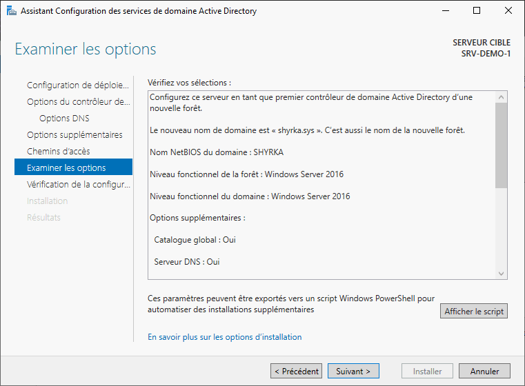 Afficher le script. C'est notamment utile dans les cas d'automatisation. Une fois les paramètres vérifiés, on valide en cliquant surSuivant >.