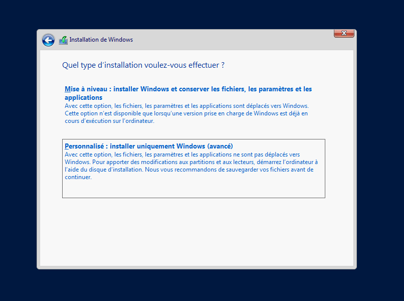 Ensuite, l'installation nous propose une Mise à niveau ou une installation Personnalisé. Dans le cas d'un nouveau serveur, la mise à niveau est une installation standard. Mais si vous lancé l'installation sur un serveur existant, cette option va passer votre ancien Windows Server en version 2019. On est sur des serveurs, c'est plutôt sensible comme opération et je ne suis pas confiant sur les systèmes de mises à niveau de Windows… Il existe plein d'outils pour opérer une migration de version d'OS donc dans ce cas là, je me baserais sur eux plutôt que sur l'option de mise à niveau.