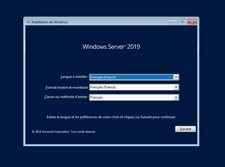 Au premier lancement de la VM, l'iso de Windows Server 2019 est chargé et le setup se lance automatiquement. On arrive alors sur l'écran de préférence linguistique.