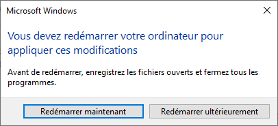- Un message d'avertissement apparaît pour nous prévenir qu'un redémarrage est obligatoire. On cliquera sur