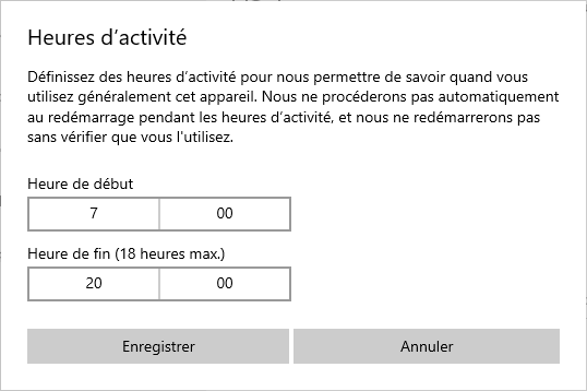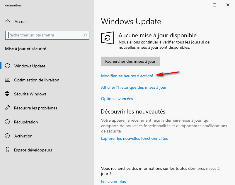 Paramètresapparaît et affiche la sectionWindows Update. On commencera par modifier les heures d'activité.