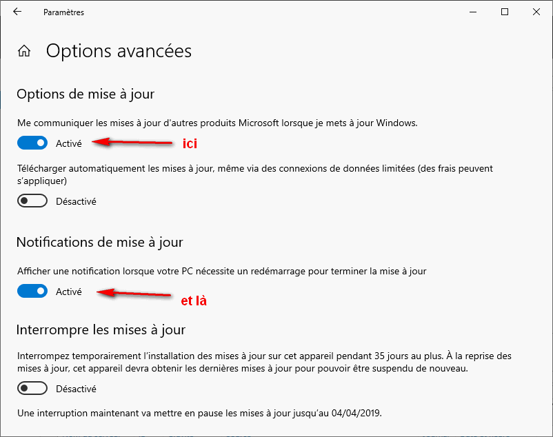 Me communiquer les mises à jour d'autres produits Microsoft…(afin de recevoir les mises à jour pour Office, Exchange, Server SQL…) etAfficher une notification…(On sait jamais).
