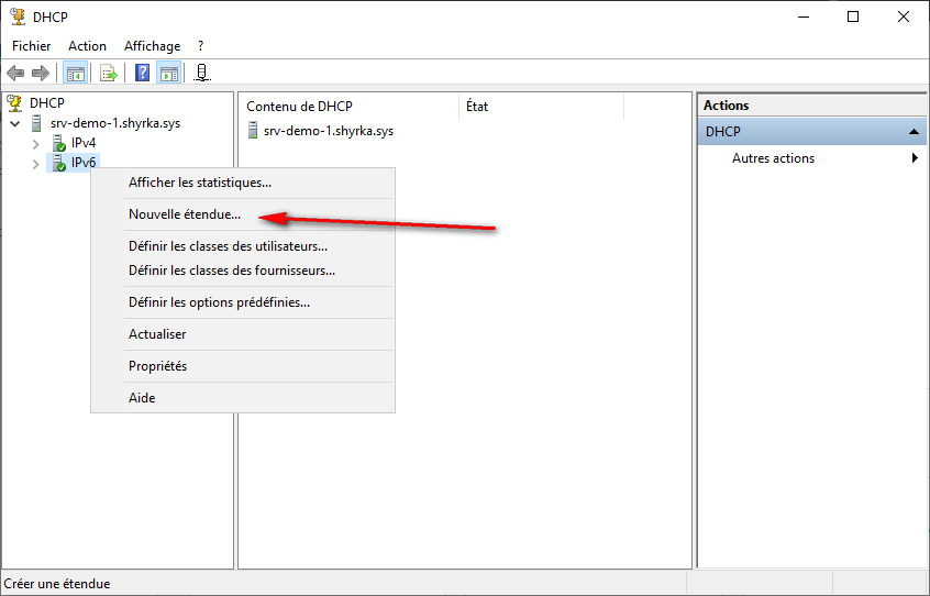 • Dans la fenêtre du serveur DHCP, on fait un clic droit sur IPv6 et on clique sur Nouvelle étendue…