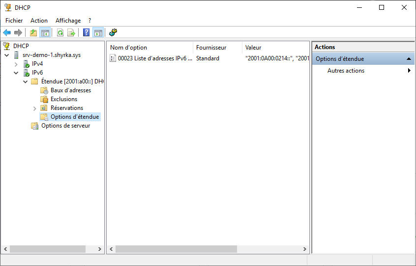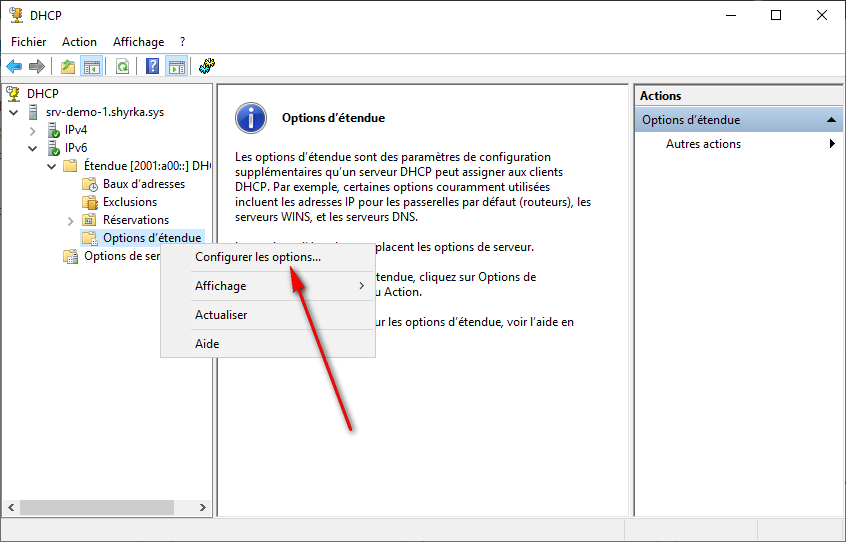 • L'étendue apparaît maintenant dans la partie IPv6. On va désormais configurer les options de l'étendue, au même titre que pour l'IPv4. Pour cela, on fait un clic droit sur Options d'étendue puis on clique sur Configurer les options….