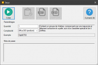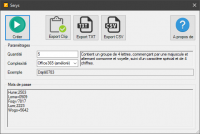 Serys est un utilitaire permettant de créer un ou plusieurs mots de passe style Office365 (génération Office 2013). Les mots de passe sont affichés dans la fenêtre principale et peuvent être exportés dans le presse-papiers, vers un fichier texte ou alors un csv.