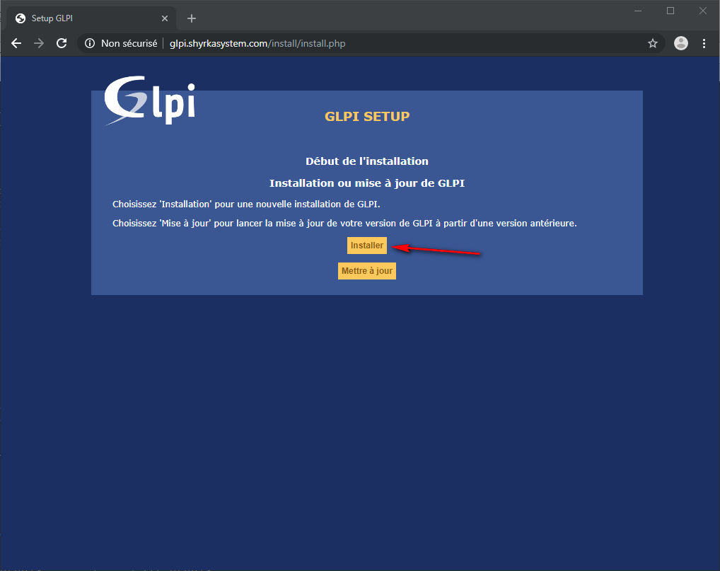 A partir de là, GLPI est installé. On peut y accéder via l'url donné dans le fichier de configuration apache. Cela nous permettra de le configurer.
