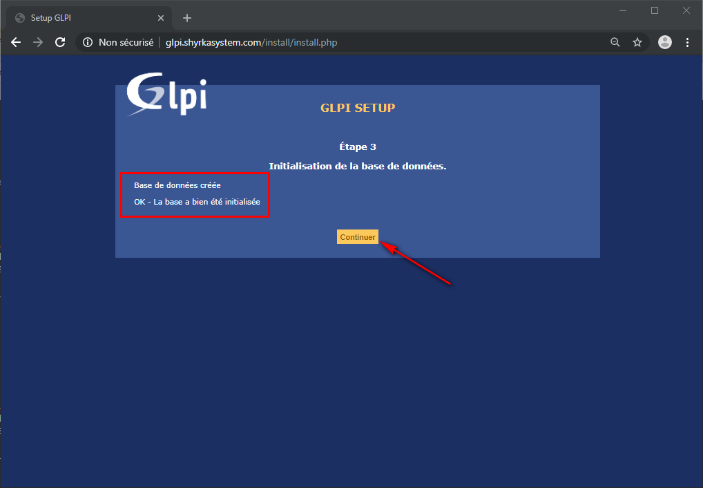 Si tout va bien, la base est alors initialisée. On peut passer à la suite en cliquant sur Continuer :