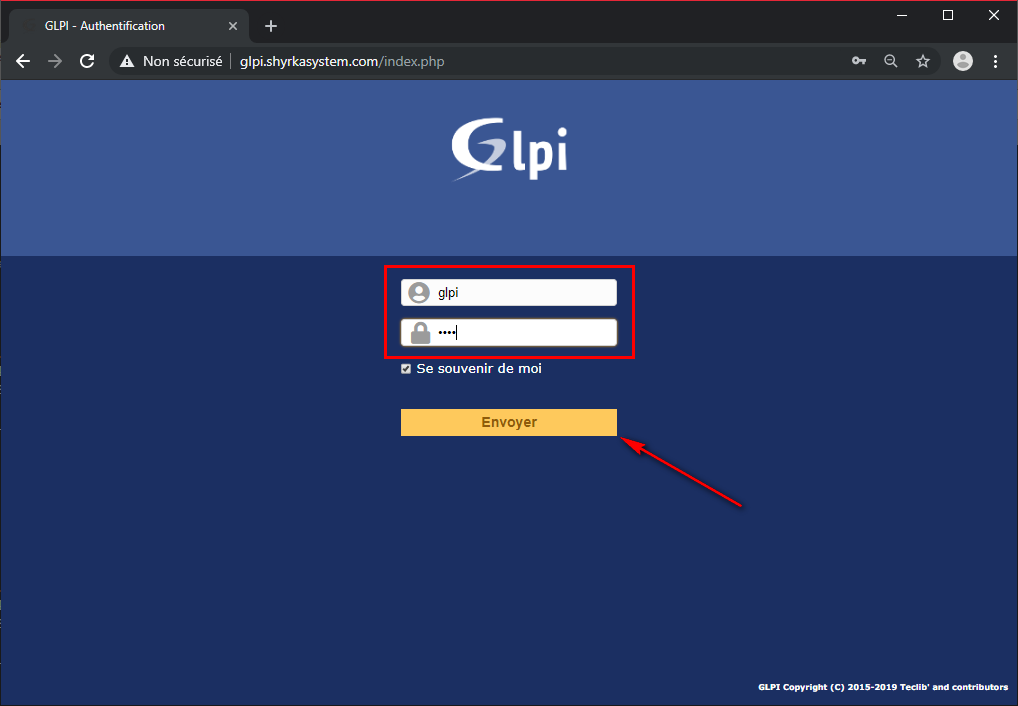 On arrive ainsi à l'écran de connexion de GLPI, où on pourra utiliser les identifiants données précédemment afin de s'authentifier :