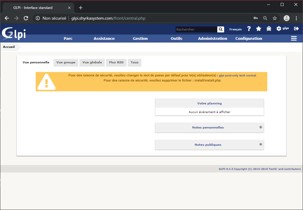 Félicitations ! GLPI est désormais utilisable. Il faudra probablement paramétrer certaines options et ajouter des plugins pour qu'il réponde parfaitement à vos attentes.Sécurité