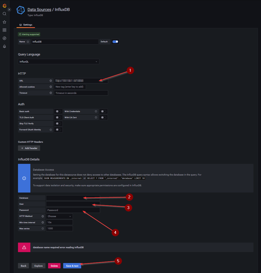 URL: l'adresse et le port du serveurinfluxdb.Database: le nom de la base.User: l'utilisateur pour la connexion.Password: le mot de passe de l'utilisateur.
