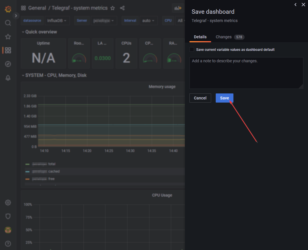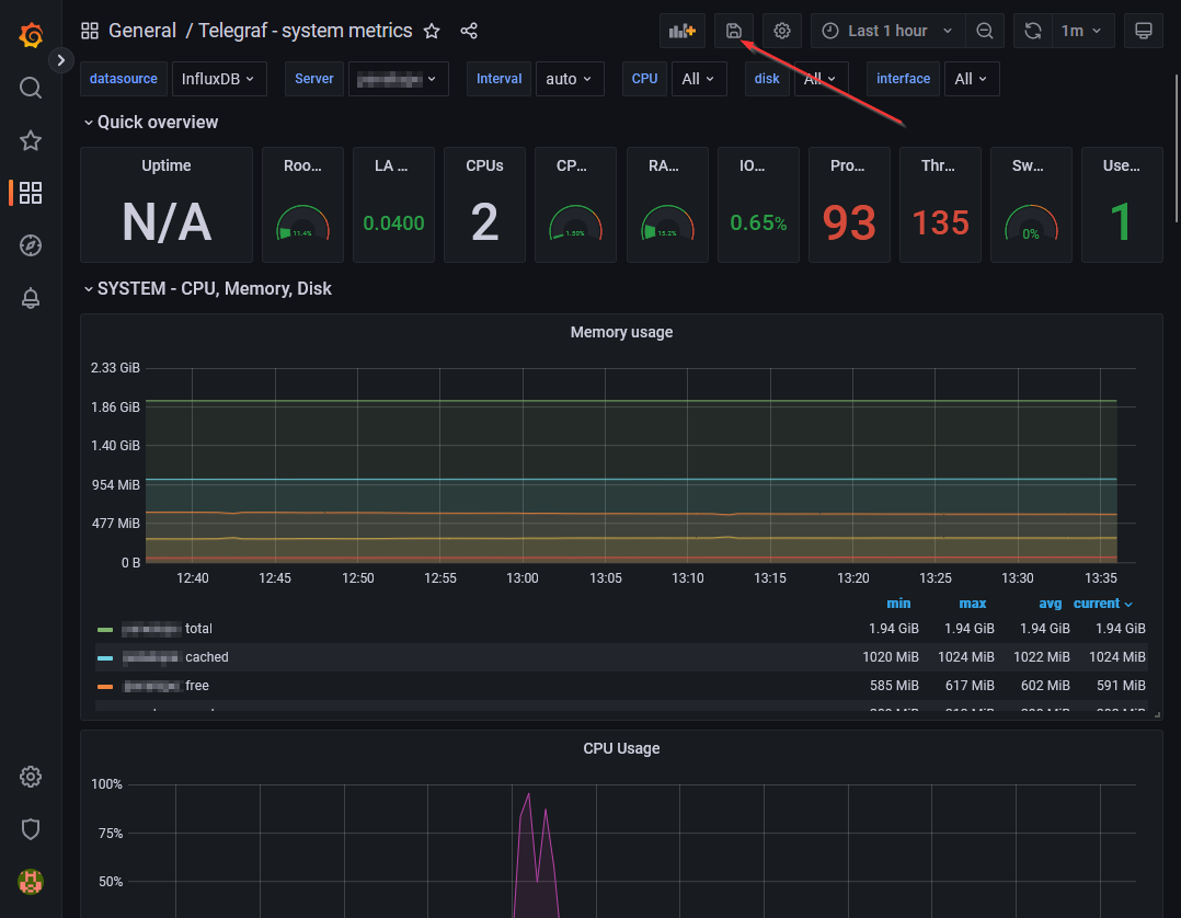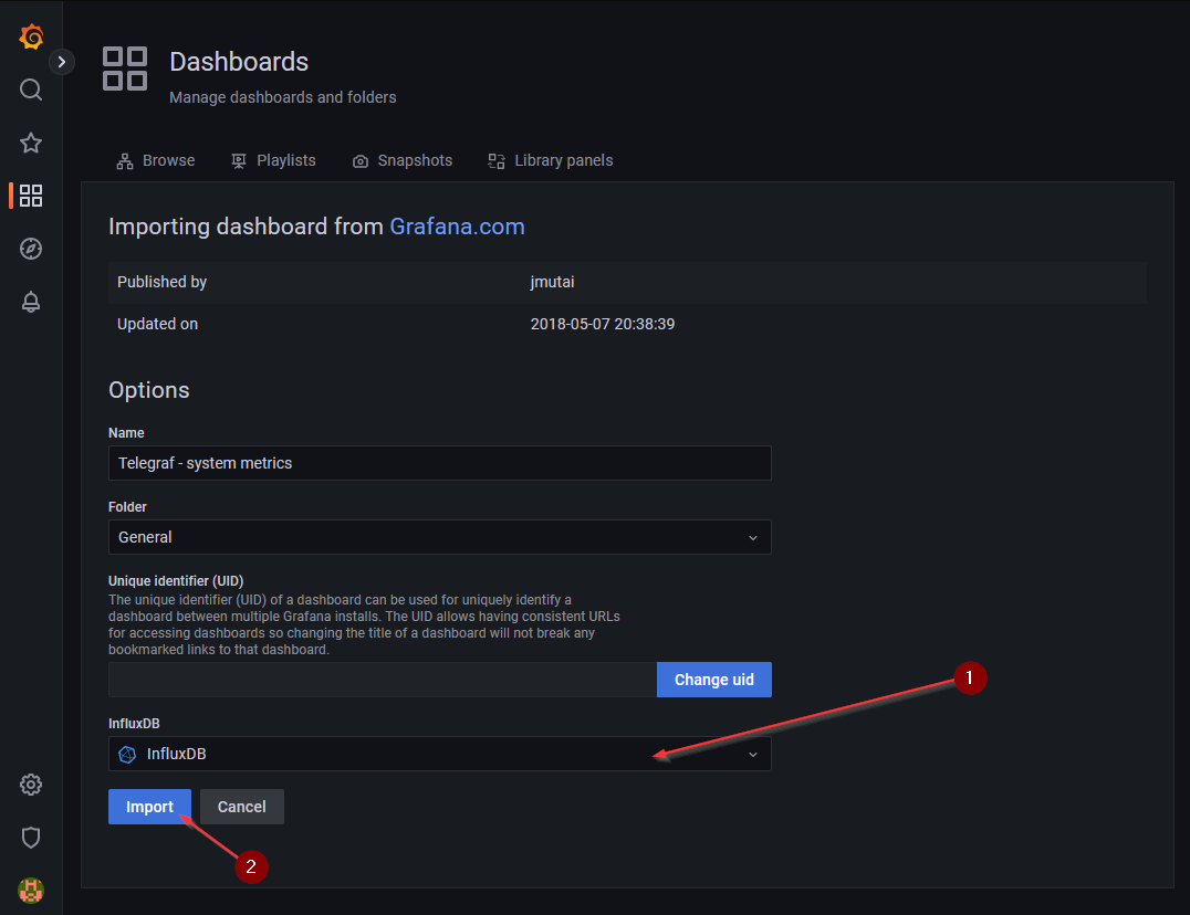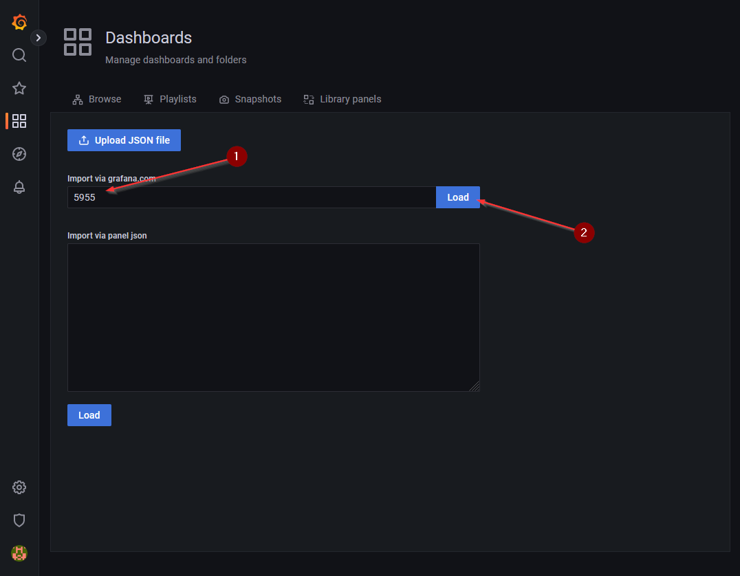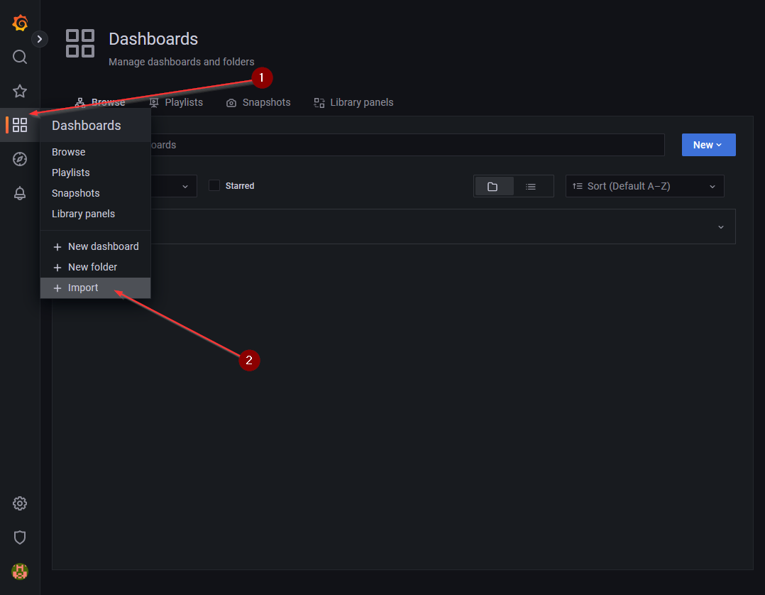 dashboard. Il est possible de le créer de toute pièce (option+ New dashboard) mais le plus simple est d'en importer un. Le site Grafana - Dashboards en propose de nombreux. Du coup, on va cliquer sur l'ongletDashboardspuis+ Import: