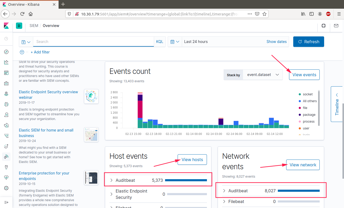 SIEM, on peut voir un graphique statistique des données reçues ainsi que le nombre de données systèmes et réseaux. On pourra alors cliquer sur :View eventspour chercher et analyser les données.View hostspour avoir une analyse par hôte.View networkpour avoir une analyse par réseau.
