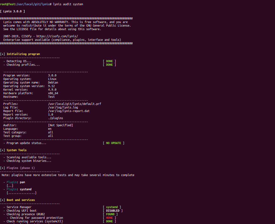 root@Test:/usr/local/git/lynis# lynis update info == Lynis == Version : 3.0.0 Status : Up-to-date Release date : 2019-11-18 Project page : https://cisofy.com/lynis/ Source code : https://github.com/CISOfy/lynis Latest package : https://packages.cisofy.com/ 2007-2019, CISOfy - https://cisofy.com/lynis/