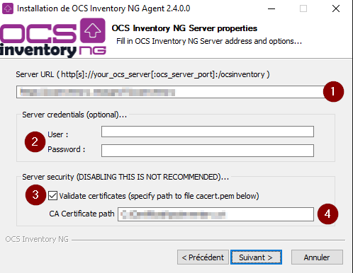 - On commencera par configurer les accès au serveur OCS en cliquant sur