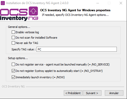 - tag : permet de spécifier une étiquette, une classification aidant l'organisattion des postes dans OCS Inventory. Exemple : tag=PC_WINDOWS