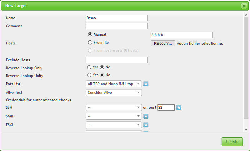Dans un premier temps il faut ajouter une cible dans OpenVAS avant de la lier à une tâche. Pour cela :