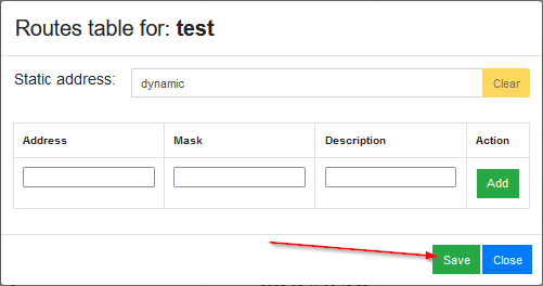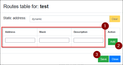 - Si l'utilisateur utilise des routes spécifiques, on les ajoute une par une en entrant l'adresse IP, le masque et la description de la route puis en cliquant sur