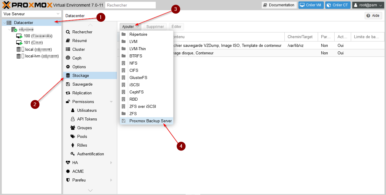Datacenter, ongletStockageet on clique surAjouterpour choisirProxmox Backup Server: