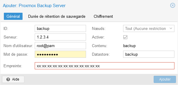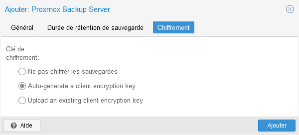 Chiffrement. On ignorera l'ongletDurée de rétention de sauvegarde, les paramètres concernés seront établis directement sur le serveur PBS. - Dans l'onglet