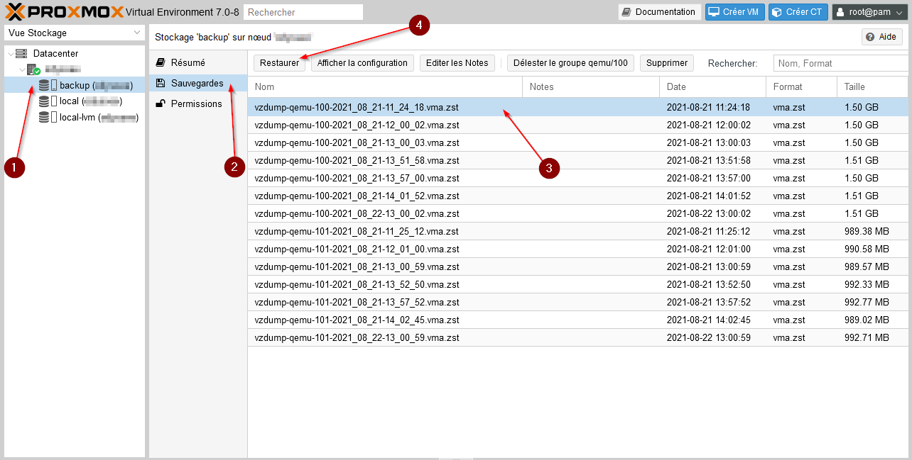 backupdans notre exemple) dans l'ongletSauvegarde. Les noms de sauvegardes donnent des indication sur la nature et la cible de la sauvegarde. Par exemple pour le fichiervzdump-qemu-100-2021_08_21-11_24_18.vma.zst:- Type de sauvegarde : vzdump