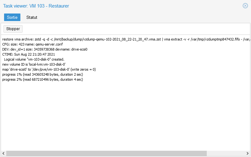 - Une fois la tâche terminée, une nouvelle VM est alors disponible dans la liste des VM portant le même nom que la VM source mais avec le nouvel ID. Vous pouver la démarrer pour récupérer des fichier précis ou supprimer l'ancienne pour la remplacer par celle-ci.