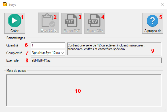 Serys est un logiciel permettant de créer à la demande des mots de passe aléatoires et répondant à certains critères de sécurité. Parmi les modèles présents, nous avons :
